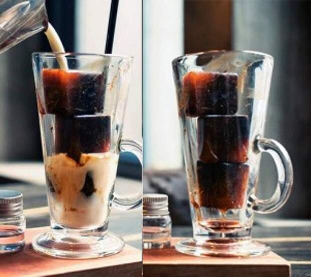 Заварите кофе удобным для вас способом и заморозьте его кубиками в морозильной камере. После чего кладите кубики замороженного кофе в стакан, и добавляй нужные компоненты: молоко, сливки, мороженое и прочее.